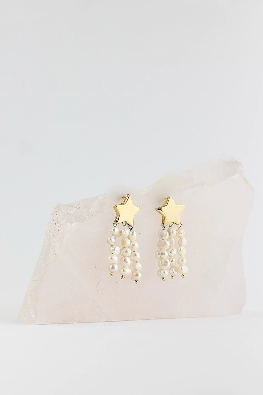 Brinco Intuição Estrela – criação autoral da designer Velma Pinheiro, semijoia com banho em ouro 18k, composta por pérolas naturais de água doce que trazem sofisticação e delicadeza, com o toque luminoso das estrelas.