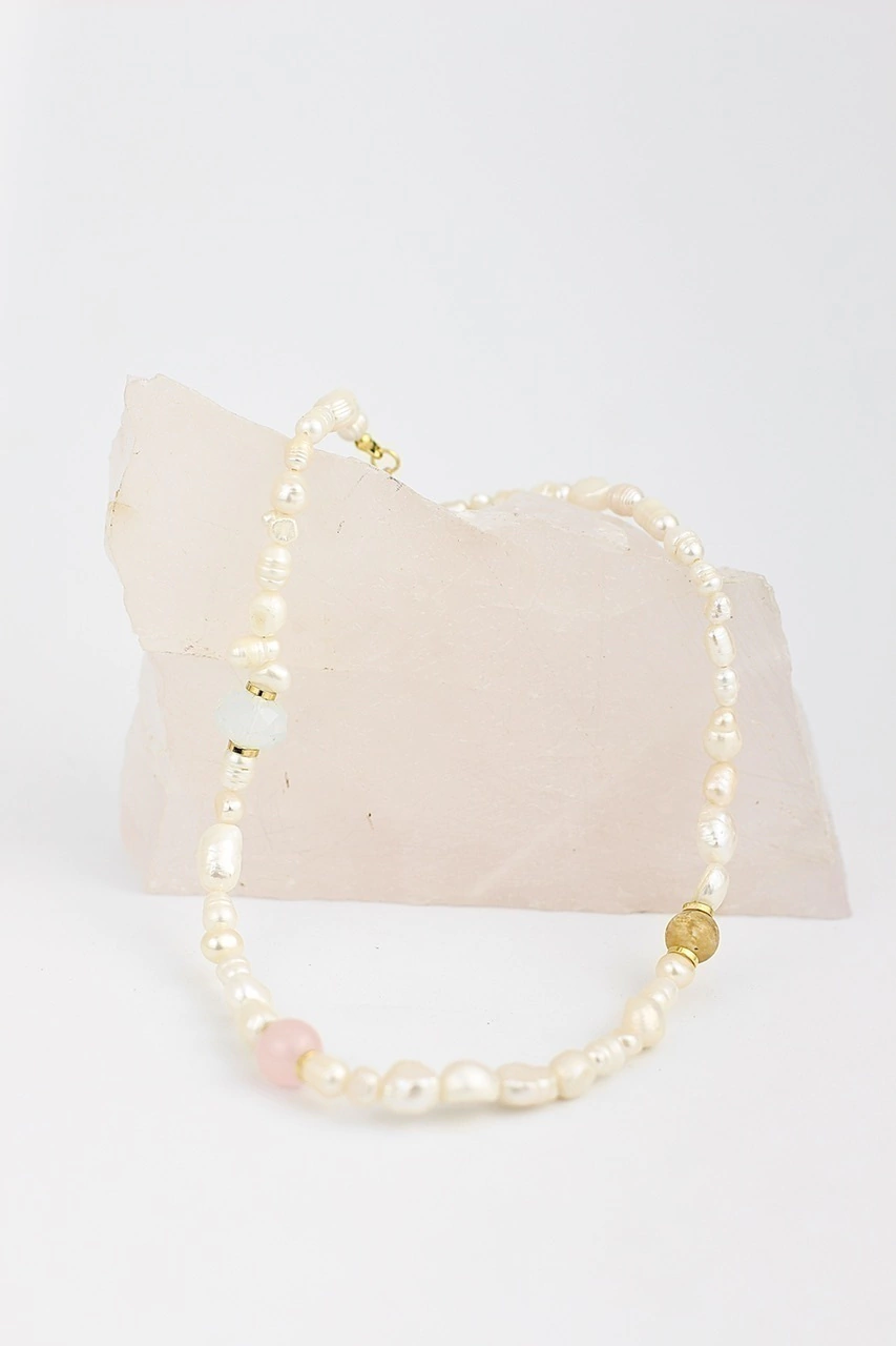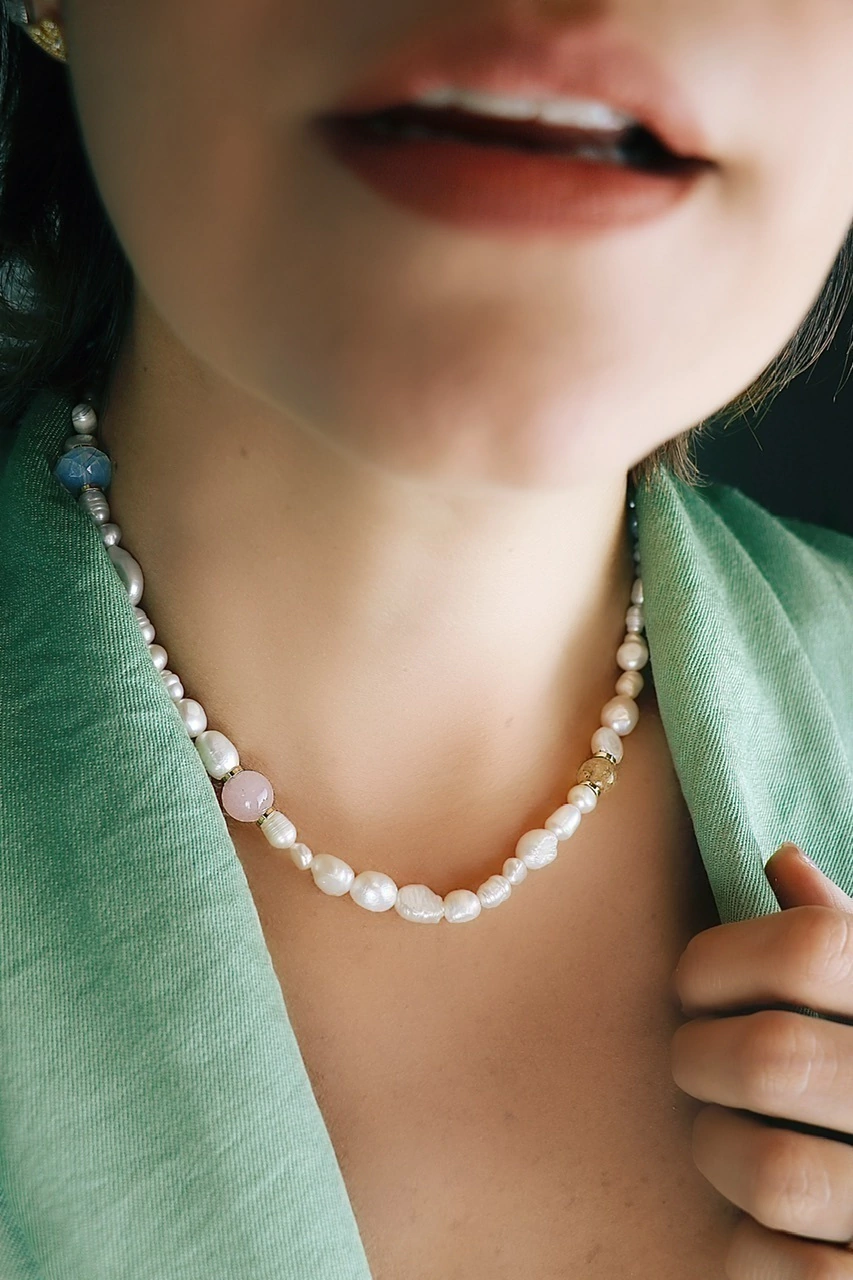 Colar Duna Pérola – criação autoral da designer Velma Pinheiro, semijoia com banho em ouro 18k, composta por cristais, pérolas naturais de água doce e pedras naturais que combinam brilho e suavidade.