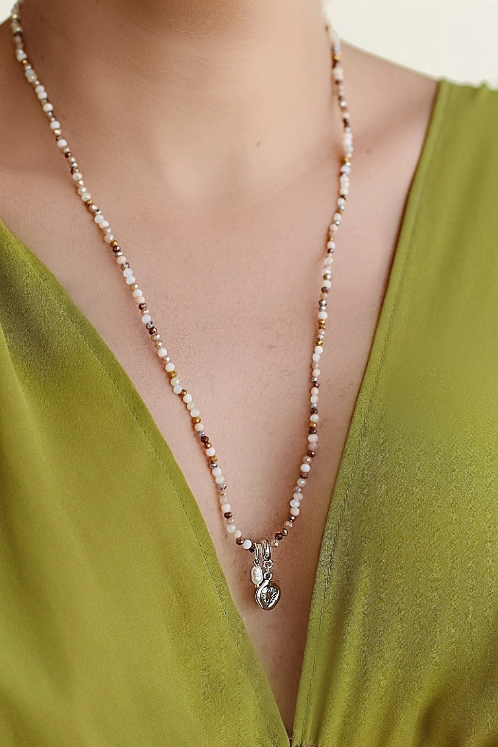 Cristais com pingentes em Pérola natural de água doce e pingente coração.