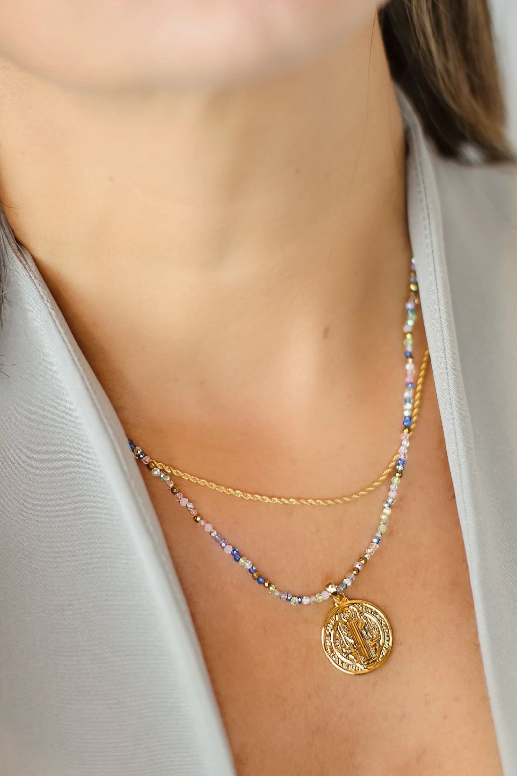 Proteção e fé que acompanham o dia a dia. Com mini cristais em tons de azul e medalha de São Bento, essa peça autoral une espiritualidade, elegância e beleza com propósito.