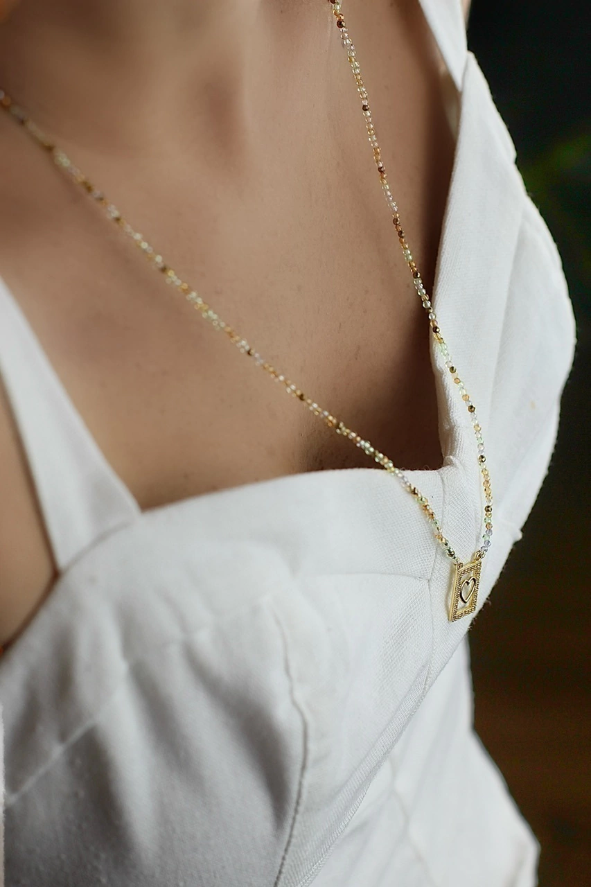 Escapulário Morada simboliza proteção e amor. Une dois elementos cheios de significado: Divino Espírito Santo, que representa paz e espiritualidade, e o pingente de coração, símbolo eterno do amor e afeto. Com acabamento de joia, o escapulário é adornado com mini cristais multifacetados que brilham delicadamente e um detalhe especial de pérola natural de água doce, trazendo elegância e suavidade. Um acessório que reflete acolhimento e fé, perfeito para acompanhar e proteger em todos os momentos.